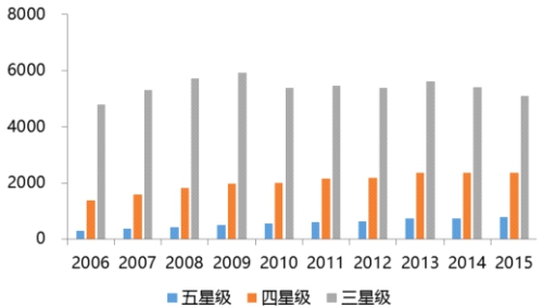 高端星級酒店存量改造市場年均增速料將超過10%。隨著國內商務活動的逐漸增多和旅游的興起,國內星級酒店得到了快速發展。截止到2015年,全國星級飯店統計管理系統中共有12327家星級飯店,其中五星級789家,四星級2375家,三星級5098家。2006-2015年度,全國五星級、四星級、三星級酒店數量的年均增長率為11.26%、6.31%、0.72%,呈現出較平穩的發展態勢。未來幾年,十年內新開業的高端星級酒店,特別是五星、四星酒店將迎來重新裝飾改造的高峰。